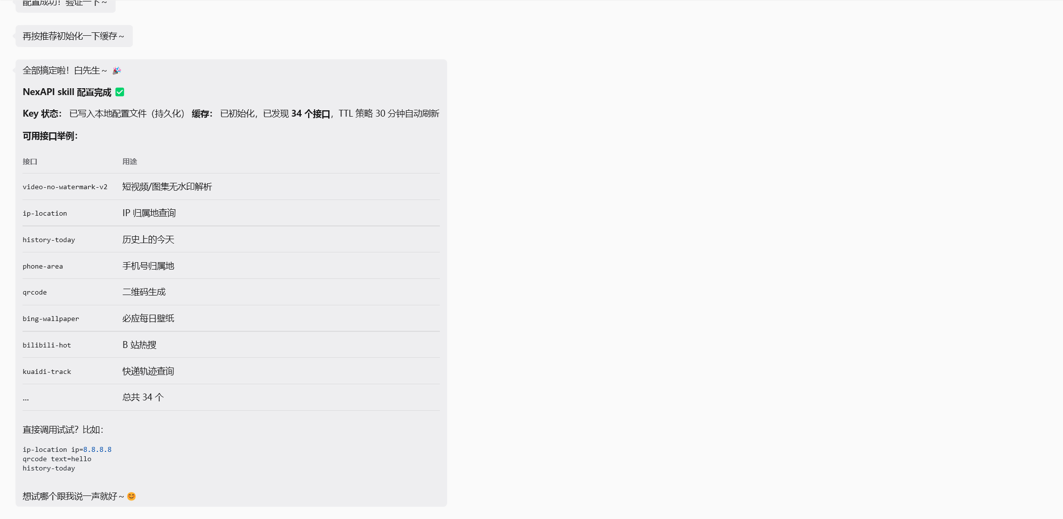 初始化完成后只需要把 API Key 丢给它配置即可。
